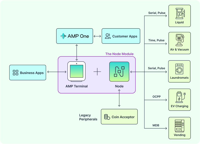 From laundromats to fuel pumps, Node takes your ecosystem to the next level, providing everything from remote telemetry and machine management to legacy peripheral integration.